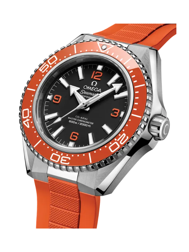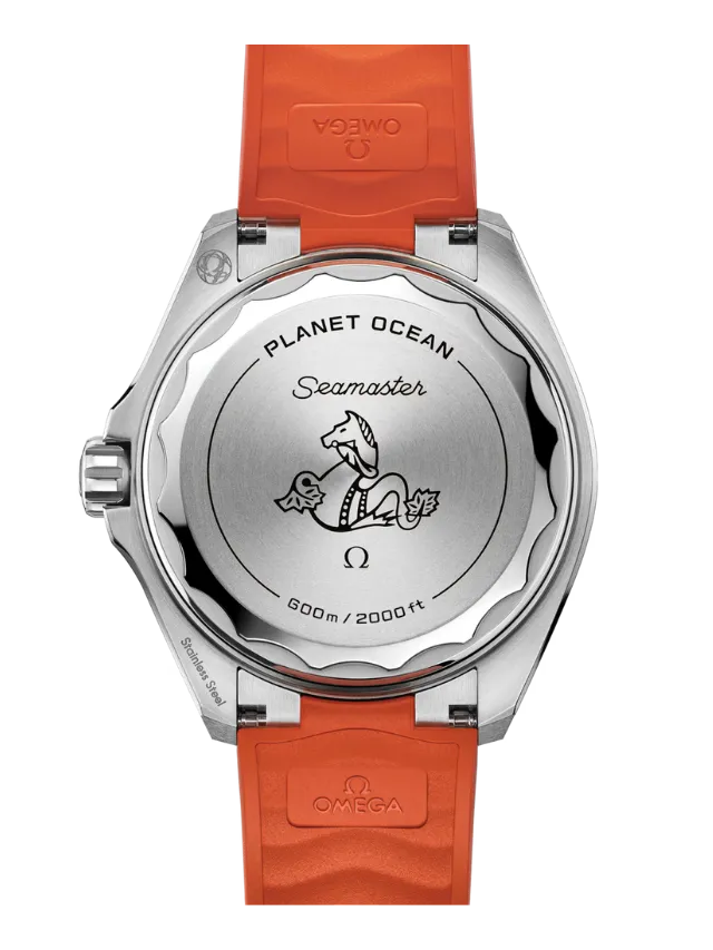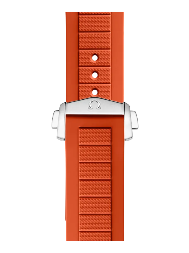 Powered by the Co-Axial Master Chronometer Calibre 8912, this Seamaster Planet Ocean is worn on an orange rubber strap with a stainless steel link to the case and a foldover clasp. On the reverse side of the watch, the screw-in caseback is made from polished-brushed grade 5 titanium, and displays OMEGA’s famous seahorse emblem.