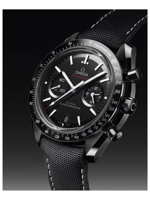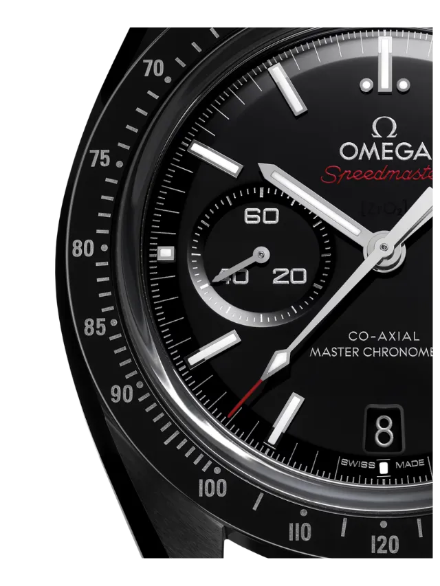 Honouring OMEGA’s legacy of space exploration, this Speedmaster Dark Side of the Moon features a 44.25 mm case in polished-brushed black ceramic. The polished bezel is also made from black ceramic and features a tachymeter scale in Liquidmetal™.