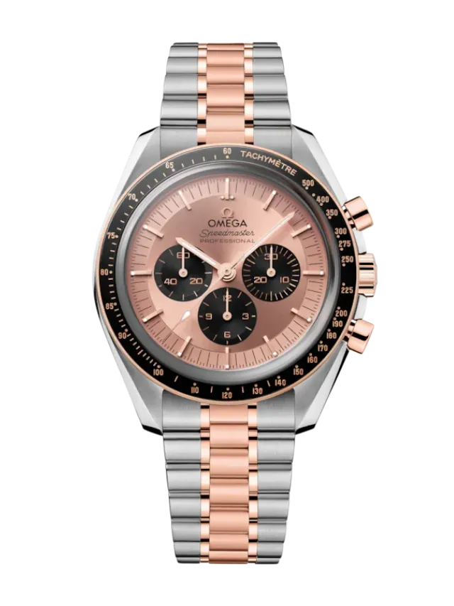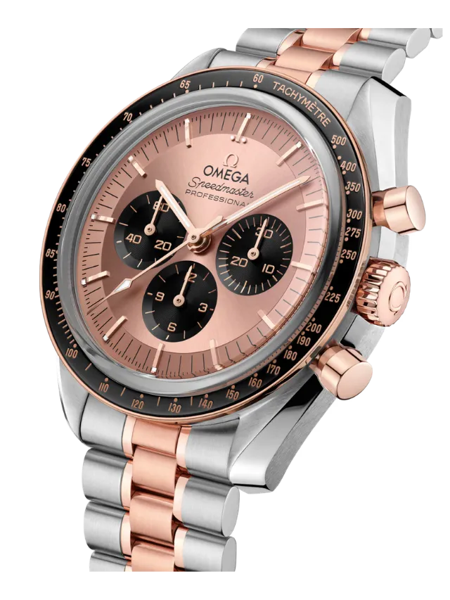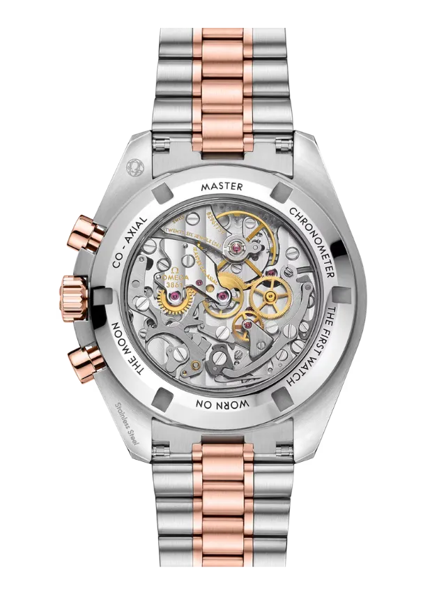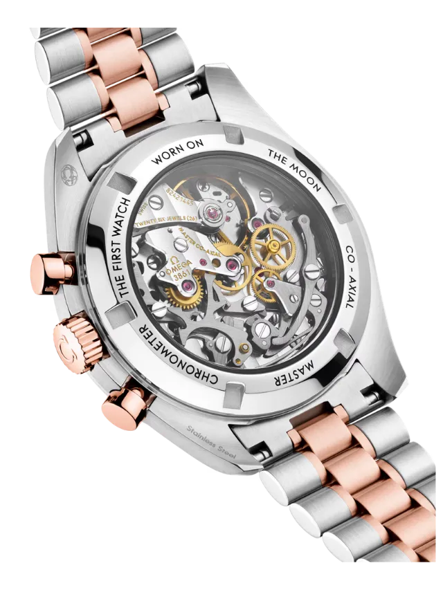 This 42 mm bi-colour model in stainless steel and 18K Sedna™ Gold features sapphire crystal glass on the front as well as on the caseback. Inspired by the 4th generation Speedmaster style worn on the moon, it includes an asymmetrical case with a black ceramic bezel ring, with its tachymeter scale and famous “dot over ninety” in OMEGA Ceragold™.