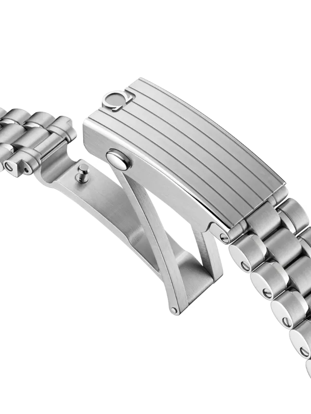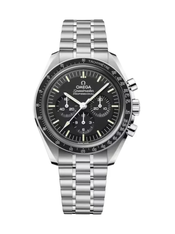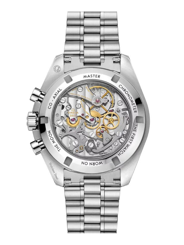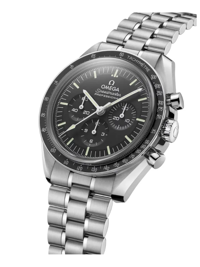 Presented on a polished-brushed five-arched-links-per-row bracelet, this 42 mm Moonwatch in stainless steel features sapphire crystal glass on the front as well as on the caseback. Inspired by the 4th generation Speedmaster style worn on the moon, it also includes an asymmetrical case, black step dial with applied OMEGA logo and the famous dot over 90 on the anodised aluminium bezel ring.
