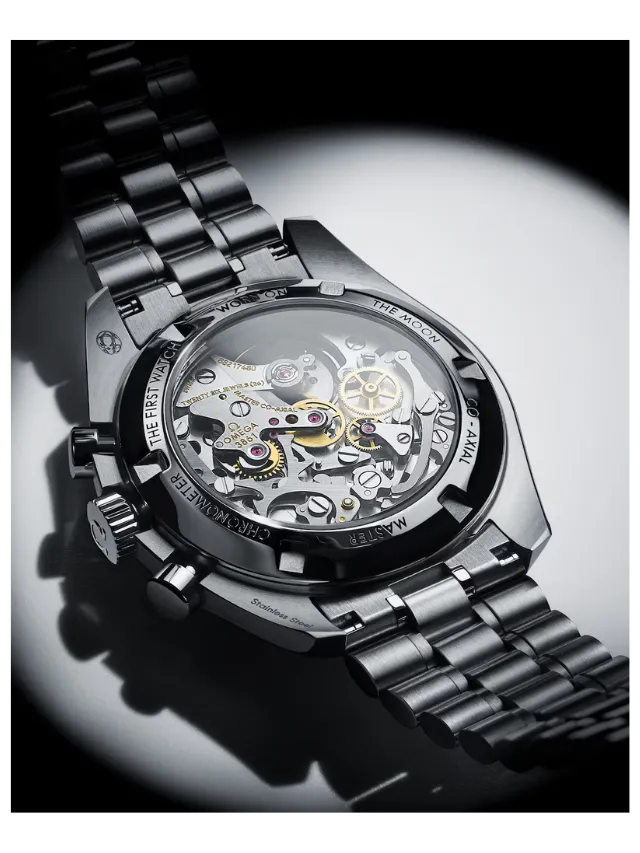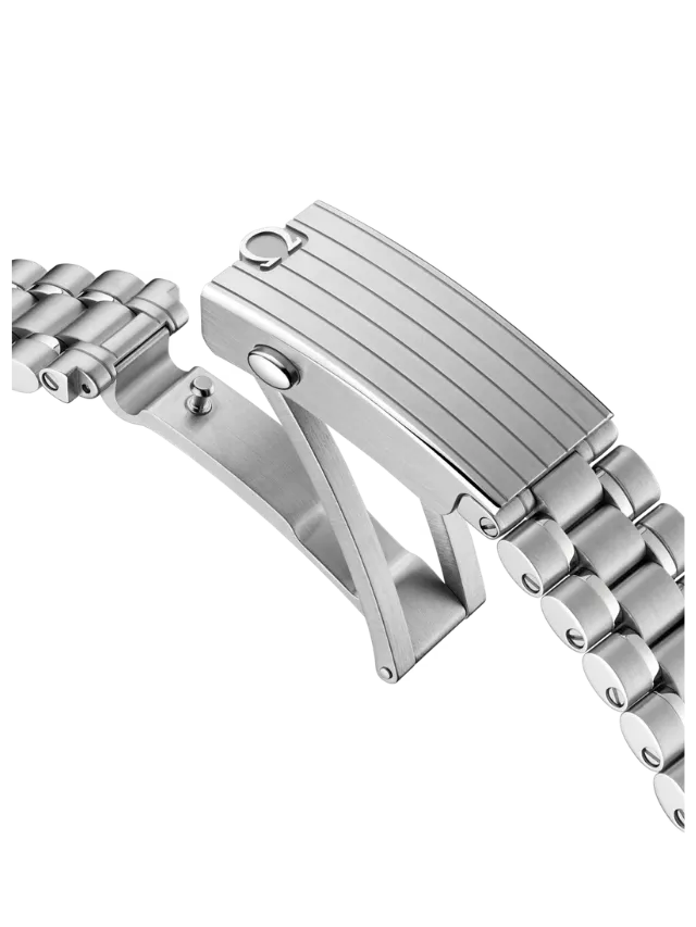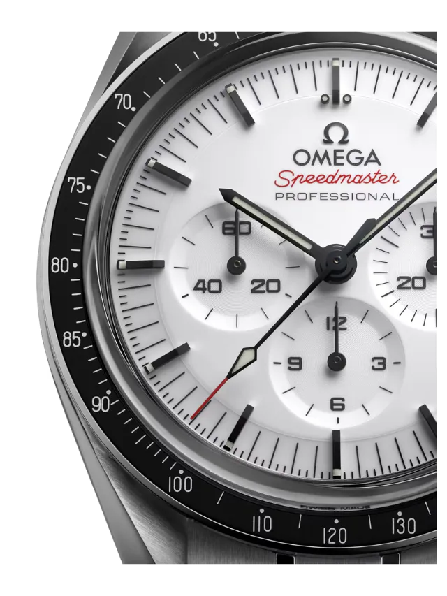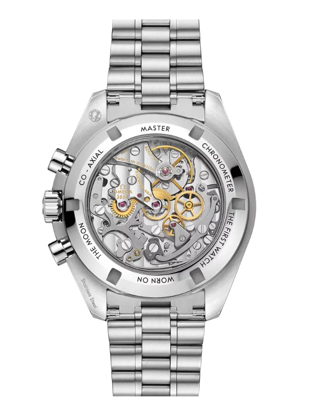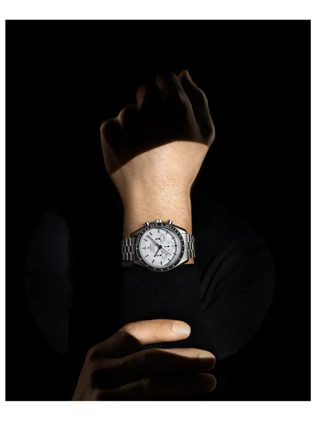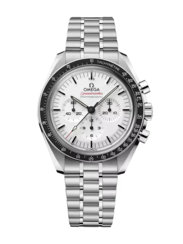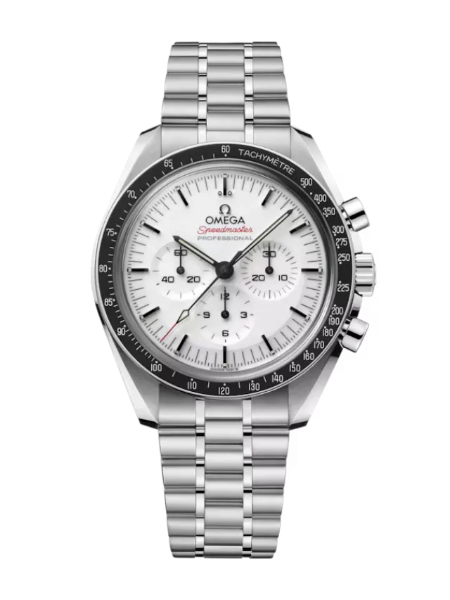 Presented on a polished-brushed bracelet, this 42 mm Moonwatch in stainless steel features sapphire crystal glass on the front as well as on the caseback. Inspired by the 4th generation Speedmaster style worn on the moon, it also includes an asymmetrical case, a white lacquered step dial with applied OMEGA logo and indexes, Moonwatch style hands, and the famous dot over 90 on the black anodised aluminium bezel ring.