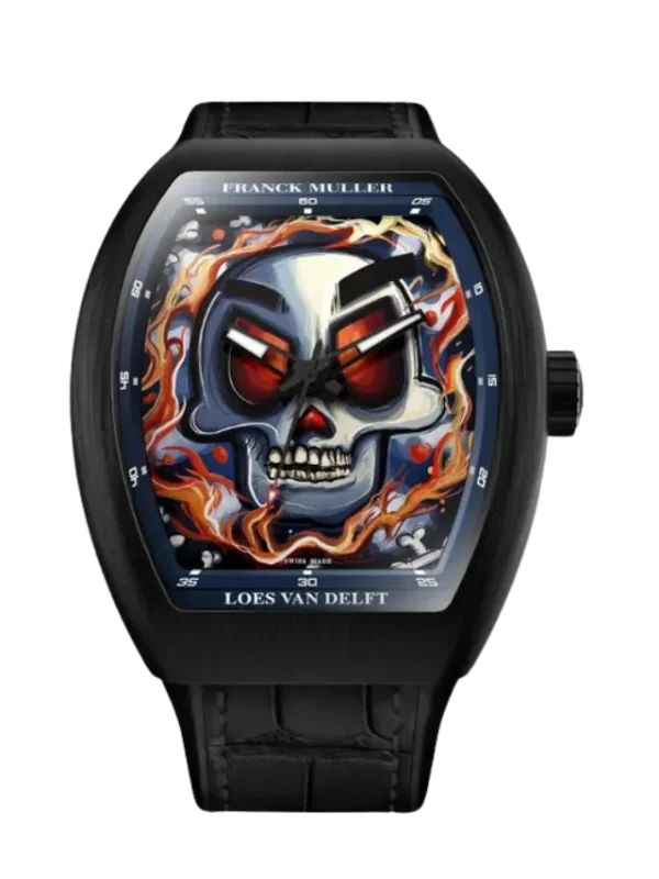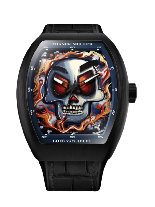 The Franck Muller Vanguard Loes Van Delft Skull Limited Edition FMV43SC SKULL features a bold tonneau-shaped case crafted in black PVD titanium, measuring approximately 42.5 mm × 52.7 mm, paired with an artistic skull motif dial that reflects a unique collaboration with artist Loes Van Delft. Produced in a limited edition of just 75 pieces, the dial showcases a striking visual design with luminous hands and a detailed outer minute track, emphasizing the brand’s avant-garde identity. Powered by a self-winding automatic movement with approximately 42 hours of power reserve, the watch displays hours, minutes, and central seconds. It is completed with a black alligator leather strap, combining high-end craftsmanship with expressive artistic design, making it a standout collector’s timepiece within the Vanguard collection.