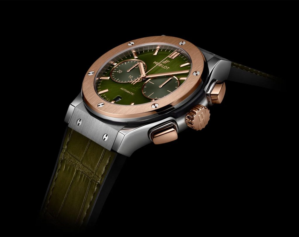 This limited edition blends cultural storytelling with refined design. The combination of titanium, King Gold, and a green dial of the Hublot Classic Fusion Chronograph Titanium King Gold 45mm adds depth without excess.